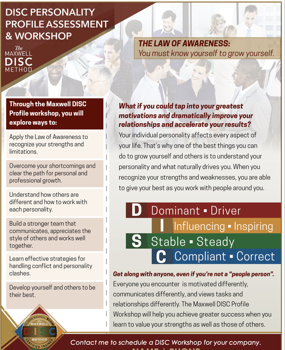 The Maxwell Method of Impact Reports take the best of the Maxwell Method, built on the principles of leadership expert John C. Maxwell and using a D.I.S.C. based Assessment tool, provides you as a Executive Program Leader with something uniquely valuable for those you serve.